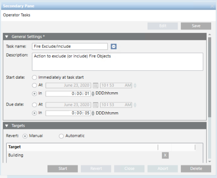 3. The task editing fields display in the Secondary pane. In the Targets expander, the target is automatically set based on the selected object. In this example, Building.