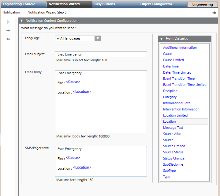 NOTE: The default text is provided for Email subject, Email body and SMS/Pager text when you select the All languages option. - Enter the subject line in the Email subject field. The maximum subject line length is 160 characters.