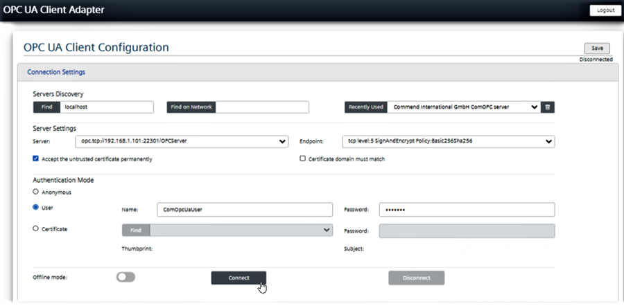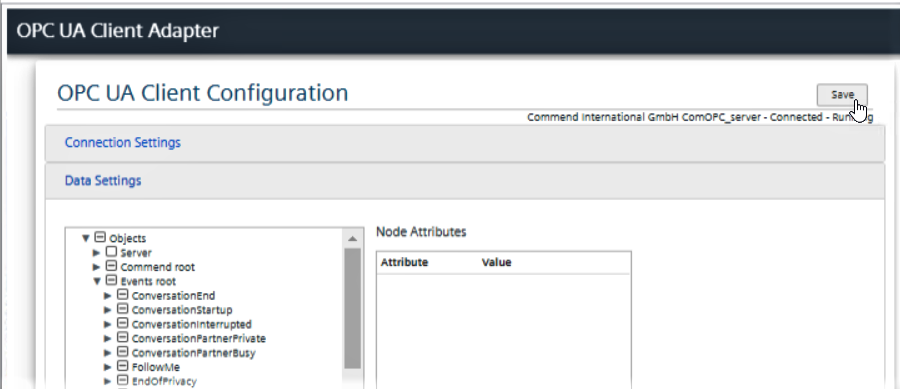 - In Connection Settings, connect to the Commend OPC Server.