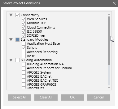 2. In the Select Project Extensions dialog box that displays, expand the desired extension suite and select the extension that you want to add to/remove from the project.