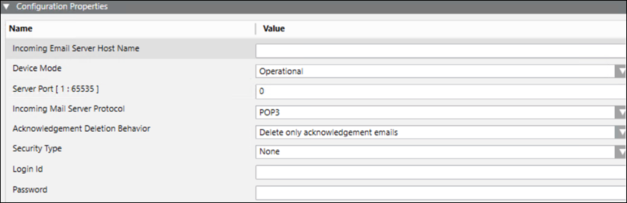 6. In the Configuration Properties expander, configure the parameters for Incoming Email Server as stated below:
