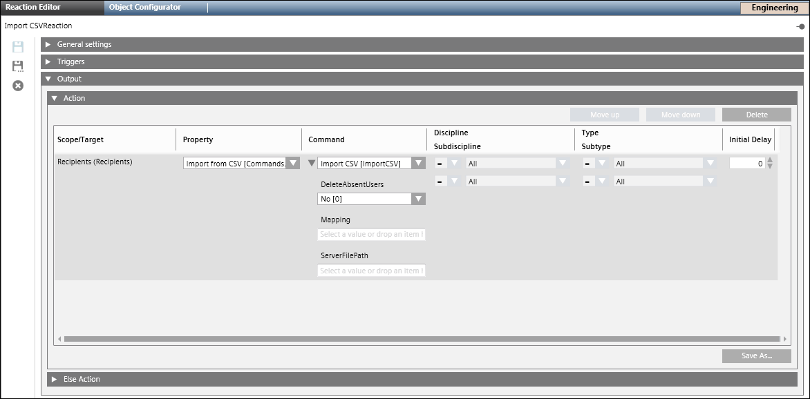 - Click Save As and enter the name and description for the Import CSV Reaction.