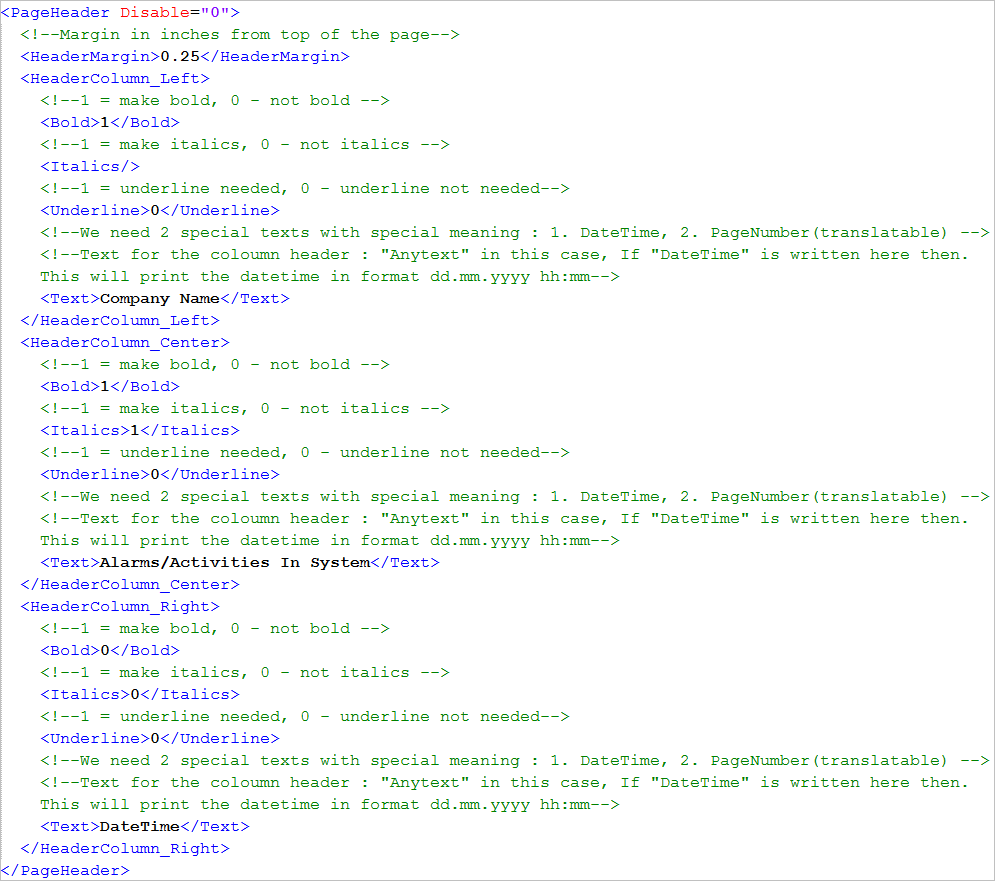 2. (Optional) In <PageHeader>, specify Disable =1” to disable the page header in the print out, and Disable =0” to enable the Page Header in the print out. The default is Disable =0”.