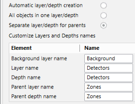 Select Separate layer/depth for parents to create a single depth and a unique layer for all CAD objects imported from the CAD drawing, and then create a second depth with a unique layer for the parent objects. If parent and child objects are both present in the CAD drawing, they are imported in the first depth, and then the grandparent objects are added separately in the second depth. In the Name column of the customization table, you can see and customize depth and layer names.