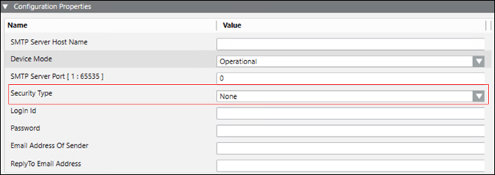 - Wenn Sie den SMTP-E-Mail-Server einrichten, konfigurieren Sie im Expander Konfigurationseigenschaften den Sicherheitstyp als entweder: