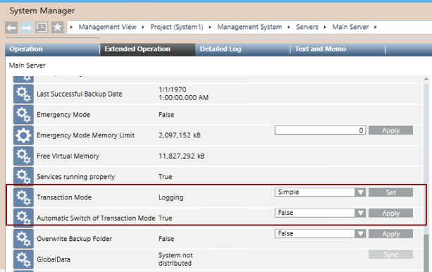 The Transaction Mode is a property of the Main Server. It sets how data is written to the project database. Its value during normal operation is Logging. It may need to be switched to Simple to speed up bulk engineering activities (such as data import, backup, and so on). This switch can be performed manually, or you can set the system to always switch the Transaction Mode automatically (recommended).