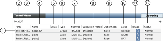 12 | Status | Displays the status of the object such as Normal, or the consolidated status of the object such as Alarm, Fault, or Technical Exclusion. |