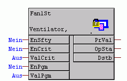The Desigo building automation and control library offers aggregates or component with different variants. The application program is compiled based on the selected variant and then loaded to the automation station. The following information is saved to the data file if a single-stage fan was selected in Desigo.