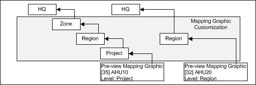 Only one mapping graphic is displayed on the selection list, even if the supplied HQ mapping graphic is modified (in the region, RC, or project). The display is hierarchical: Headquarters > Region > RC > Project.