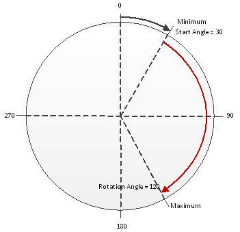 The following drawing shows how the Minimum and the Maximum property values of the Rotator command are placed in conjunction with the Start Angle and Rotational Angle for a total of less than 360 degrees, that is, less than one rotation.