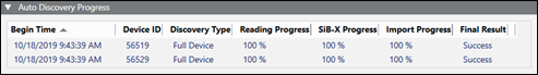 The Auto Discovery Progress expander displays and logs the discovery progress of devices. Devices are identified by ID and type, and can be sorted by the discovery start time.