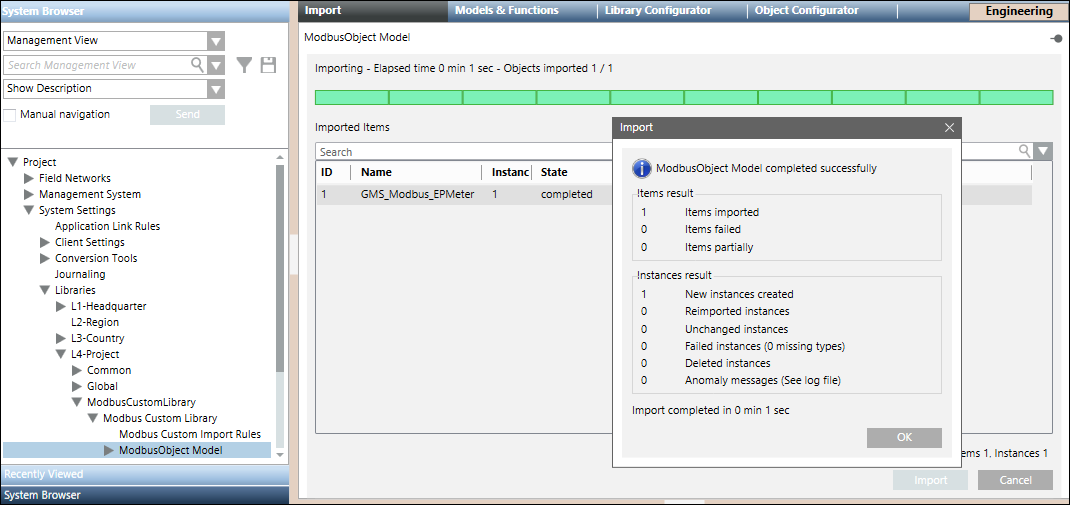 16. When the import completes successfully, the Import dialog box displays a summary of the import information.