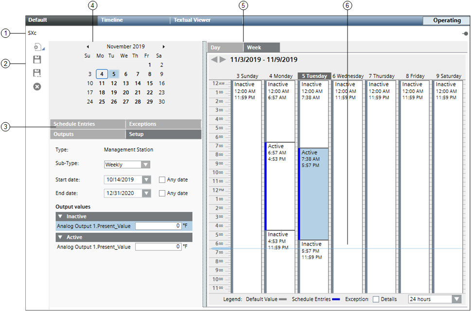 Schedule Entries: Displays a list of entries for the selected date and Output values. The Output values indicate the ON and OFF values for Daily schedules only. For weekly schedules the Output values are present in the Setup tab.