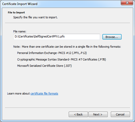9. In the Certificate Import Wizard dialog box, browse the certificate file to be imported. Click Next.