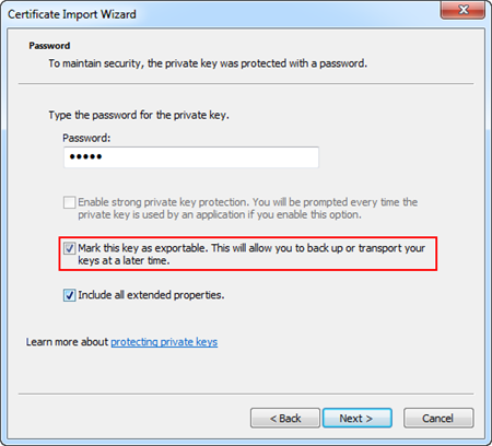 10. Select the Mark key as exportable check box for self-signed certificate pfx file import. This allows you to back up or transport your keys at a later time.
