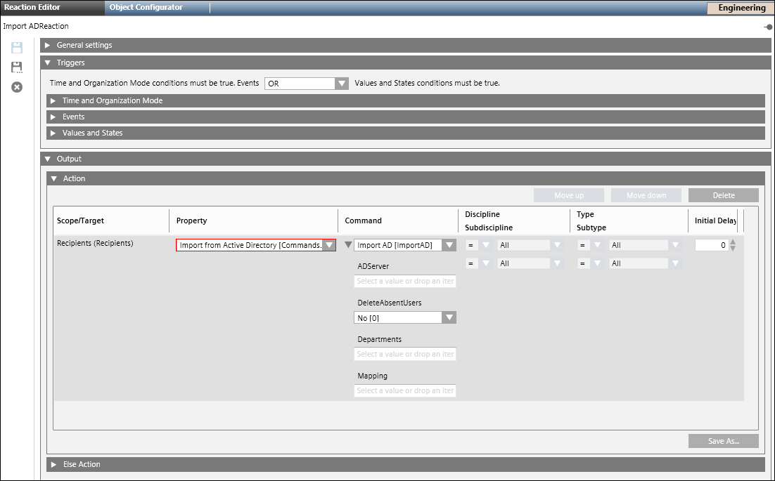 - Click Save As and enter the name and description for the Import Active Directory Reaction.