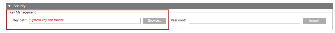 When starting up SMC on Client/FEP, system key is not created automatically. This is indicated by the Import Key displaying in red as shown in the image. If the FEP is connected to a server, you must import the key pair available on the server, into the Windows key store of the FEP. The same key is needed on the FEP so that it can decrypt the passwords which it has to use for authentication of the subsystem devices. This way a network can get reassigned to a driver on a different machine without having to reconfigure the password.