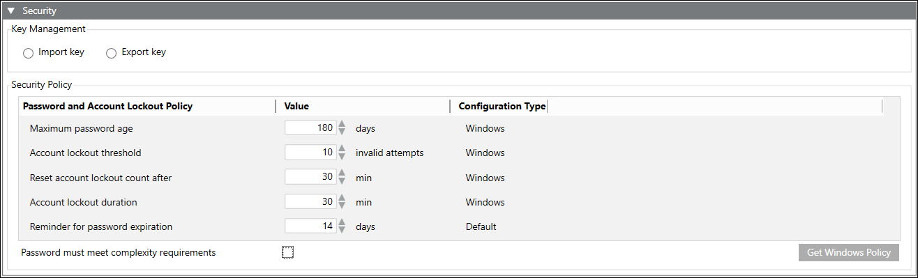 In addition to importing the Windows key, you can also view and modify the password and account lockout policies in the Security Policy section of the Security expander.