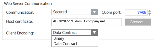 With Web Server Communication mode as Secured/Local, the Client Encoding (Data Contract/ Binary) becomes available in the Web Server Communication. In the Client Encoding drop-down list, by default, Data Contract is displayed.