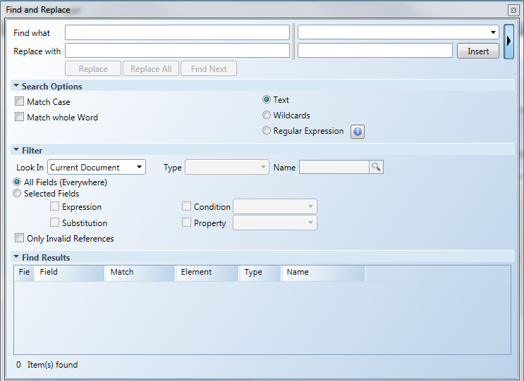 Durchsucht alle Felder inklusive Ausdrücke, Ersetzungen, Bedingungen und Eigenschaften.