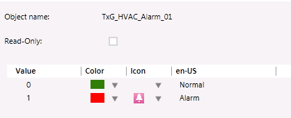 - TxG_HVAC_Alarm_01.1 = Dies referenziert den Zustand Normal (siehe oben), der von der Farbe Grün dargestellt wird.