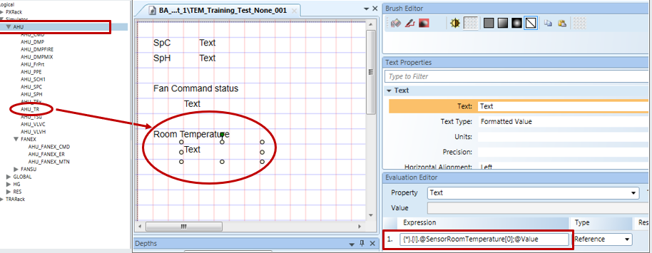 Zum Beispiel: Wenn die Grafikvorlage vom AHU-Knoten aus aufgerufen wird, soll sie die Eigenschaft "Value" (Wert) des ersten Datenpunkts unterhalb der AHU anzeigen, dem die Funktion "SensorRoomTemperature" (Raumtemperaturfühler) zugewiesen ist. {*}.[l].@SensorRoomTemperature[0];@Value Ergebnis: Die Vorlage zeigt den aktuellen Wert für den Knoten AHU_TR an. Die [0] löst einen einzelnen Wert entsprechend dem Index auf. |