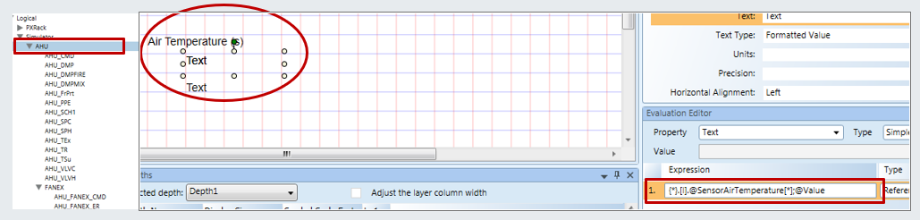 Zum Beispiel: Wenn die Vorlage vom AHU-Knoten aus aufgerufen wird, soll sie die Daten für die Eigenschaft "Value" (Wert) für alle Datenpunkte unterhalb der AHU anzeigen, denen die Funktion "SensorAirTemperature" (Lufttemperaturfühler) zugewiesen ist. {*}.[l].@SensorAirTemperature[*];@Value Ergebnis: Die Vorlage repliziert und zeigt den aktuellen Wert für die Knoten AHU_TR an. Der [*] löst alle Werte auf, die die Bedingung erfüllen. |