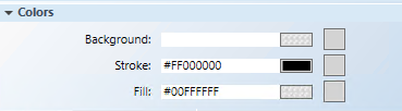 - Wählen Sie das Schaltflächenelement (z. B. Rechteck) im Zeichenbereich und erweitern Sie in der Eigenschaftenansicht die Eigenschaftengruppe Farben. Dem Schaltflächenelement muss eine Farbe für den Hintergrund oder als Füllfarbe zugewiesen sein, so dass ein wählbarer Bereich zu sehen ist. Wenn Sie beide Eigenschaften leer lassen, kann das Schaltflächenelement nicht ausgewählt werden. Formatieren Sie das Schaltflächenelement mit folgenden Eigenschaften.