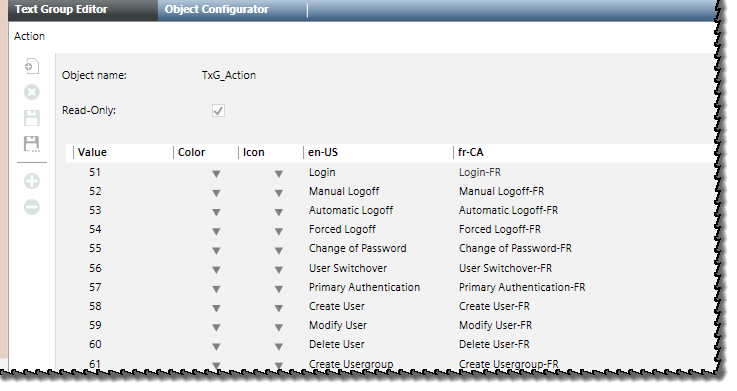 Um Text aus einer Textgruppe zu referenzieren, erstellen Sie ein Textelement im Zeichenbereich, wählen in der Eigenschaft Texttyp manuell die Option Übersetzter Text, und geben dann den Namen des Textgruppenobjekts und den mit dem Zieltext verknüpften Wert in das Eigenschaftsfeld Text ein. Die Syntax für die Eingabe eines Namens eines Textgruppenobjekts und die Angabe eines Werts aus der Textgruppe lautet: [TextGroupObjectName].[Value]. Die beiden Komponenten werden durch einen „:“ getrennt. Zum Beispiel [TxG_Action.55]. Die Textreferenz auf en-US für den Wert 55 in dieser Textgruppe ist Change of Password.