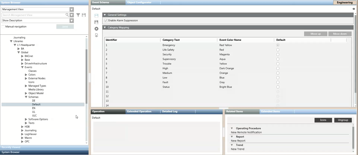 Das Ereignisschema ist eine Konfiguration in einer Ereignisbibliothek, die definiert, wie Alarme dem Benutzer präsentiert werden: welche Ereigniskategorien in einer Desigo CC-Installation verwendet werden, ihre entsprechenden Kategoriefarben und die Zuordnung verschiedener Alarmtypen zu diesen Kategorien und zu Ereignisstönen.