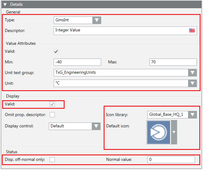 Objekt, das die gültigen Bereichswerte enthält. Einzelheiten finden Sie unten in der Tabelle GmsInt-Eigenschaften. Wenn das Objekt leer ist ("Eigenschaften": { }), werden die Bereichswerte zurückgesetzt und es gilt der Bereich Int32.MinValue ÷ Int32.MaxValueoder -128 ÷ 127 gemäss dem PvssType.
