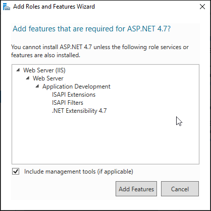 d. In dem Dialogfeld, das sich nun öffnet, werden Sie aufgefordert, das Hinzufügen der zusätzlichen Features, die für ASP.Net 4.7 oder ASP.Net 4.8 installiert sein müssen, zu bestätigen.