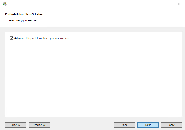 Execute = AskUserbei neuen Erweiterungen bzw.InvolvedInUpgradeWorkflow = AskUserbei bereits installierten, aktualisierbaren Erweiterungen in der Datei [GMS\EMName]PostInstallationConfig.xml konfiguriert ist, werden im Dialogfeld Auswahl der Schritte nach der Installation angezeigt.