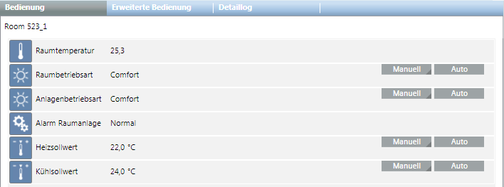 - Die Raumgrafik wird geöffnet und die wichtigsten Werte werden im Register Bedienung angezeigt.