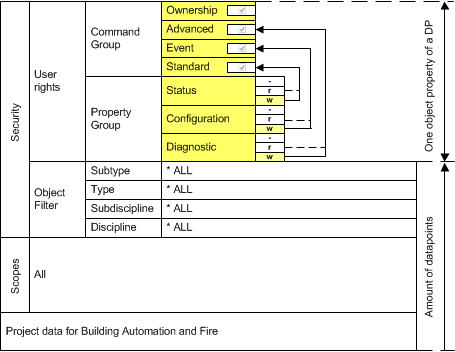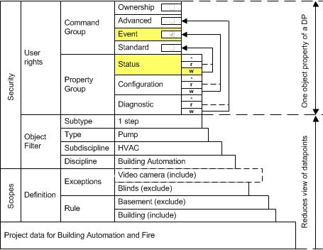 In Desigo CC bestimmen verschiedene Faktoren die Zugriffsrechte auf ein Objekt. Wenn Sie einer Benutzergruppe volle Zugriffsrechte vergeben wollen, müssen Sie keine Scopes definieren. Für das Bedienen und Überwachen müssen Sie der Eigenschaftengruppe Schreibberechtigungen zuweisen und die Befehlsgruppe aktivieren. In der folgenden Abbildung werden umfassende Zugriffsrechte verdeutlicht.