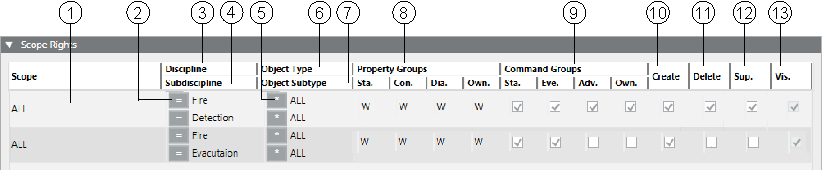Scopes (siehe Scopes) kommen in verschiedenen Applikationen zum Einsatz, z.B. Protokoll, Alarmierung und Makros, um Anzeige und Bedienung festzulegen. Im Arbeitsbereich Sicherheit werden Scopes für die Konfiguration der Zugriffsrechte einer Gruppe verwendet. Sie können einer Gruppe mehrere Scopes zuweisen, wodurch Sie verschiedene Rechte an einem Scope für verschiedene Filtereinstellungen festlegen können, zum Beispiel Disziplin, Subdisziplin, Objekttyp oder Objekt-Subtyp.