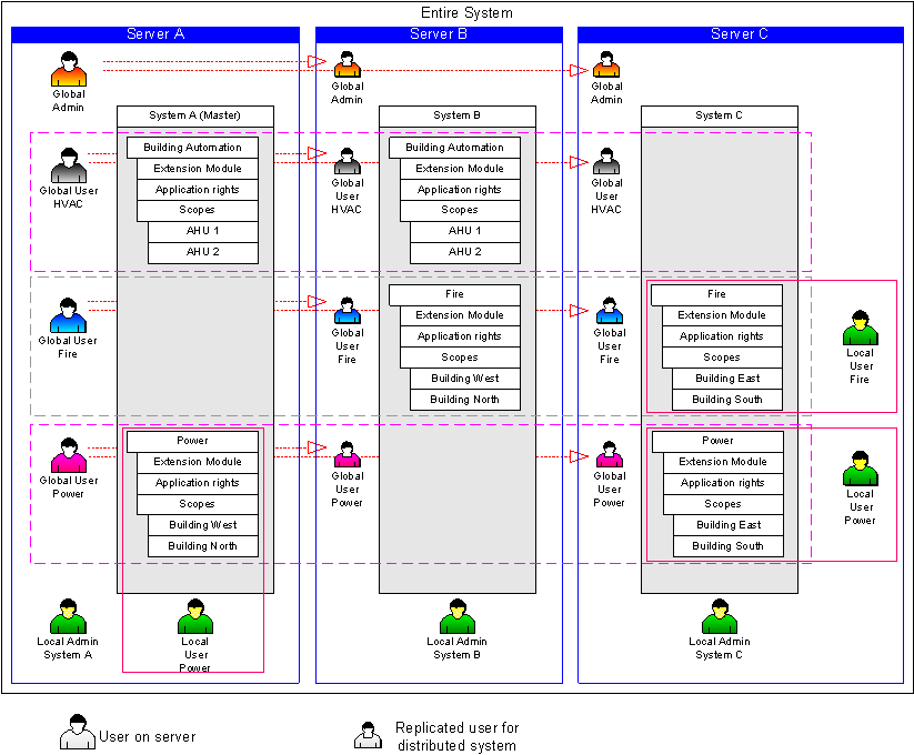 Globale Benutzergruppen und Benutzer können nur auf dem Mastersystem angelegt und verwaltet werden. Diese globalen Informationen werden kontinuierlich mit den verteilten Managementstationen synchronisiert. Auf jeder bekannten Managementstation wird mit anderen Worten eine Kopie der Benutzergruppe bzw. des Benutzers erstellt. Ein globaler Benutzer hat potenziell Zugriff auf Objekte auf anderen Systemen.