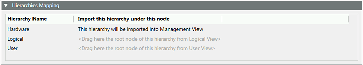 Bevor Sie OPC-Items aus einer Konfigurationsdatei importieren, können Sie im Expander Hierarchien definieren, in welche System Browser-Ansicht die Objekthierarchien importiert werden, d.h. wo sie entsprechend der Verwaltungsebene, technischen Ebene oder benutzerdefinierten Ebene automatisch erstellt werden. Standardmässig ist die Hierarchie Hardware nur der Managementsicht zugewiesen. Um sie der Technischen Sicht zuzuweisen, müssen Sie diese dem Basisordner für Ansichten zuweisen.