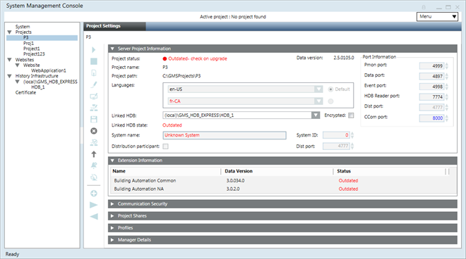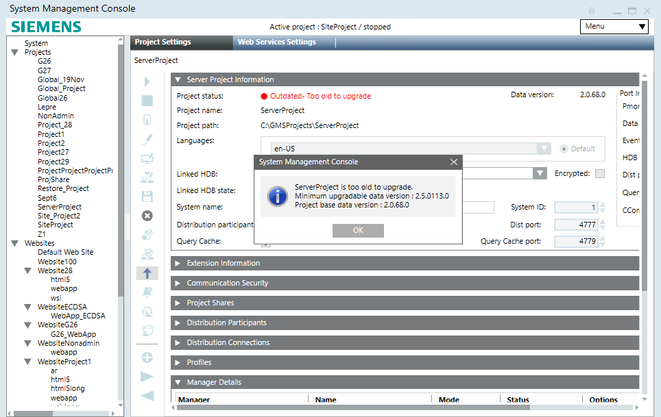 Unknown system(in rot) und System-ID als0(in rot) angezeigt, was bedeutet, dass das wiederhergestellte Projekt eine ältere Datenversion als die aktuelle Datenversion in Desigo CC hat. Der Systemname und die System-ID des wiederhergestellten Projektes werden beim Upgrade angezeigt.