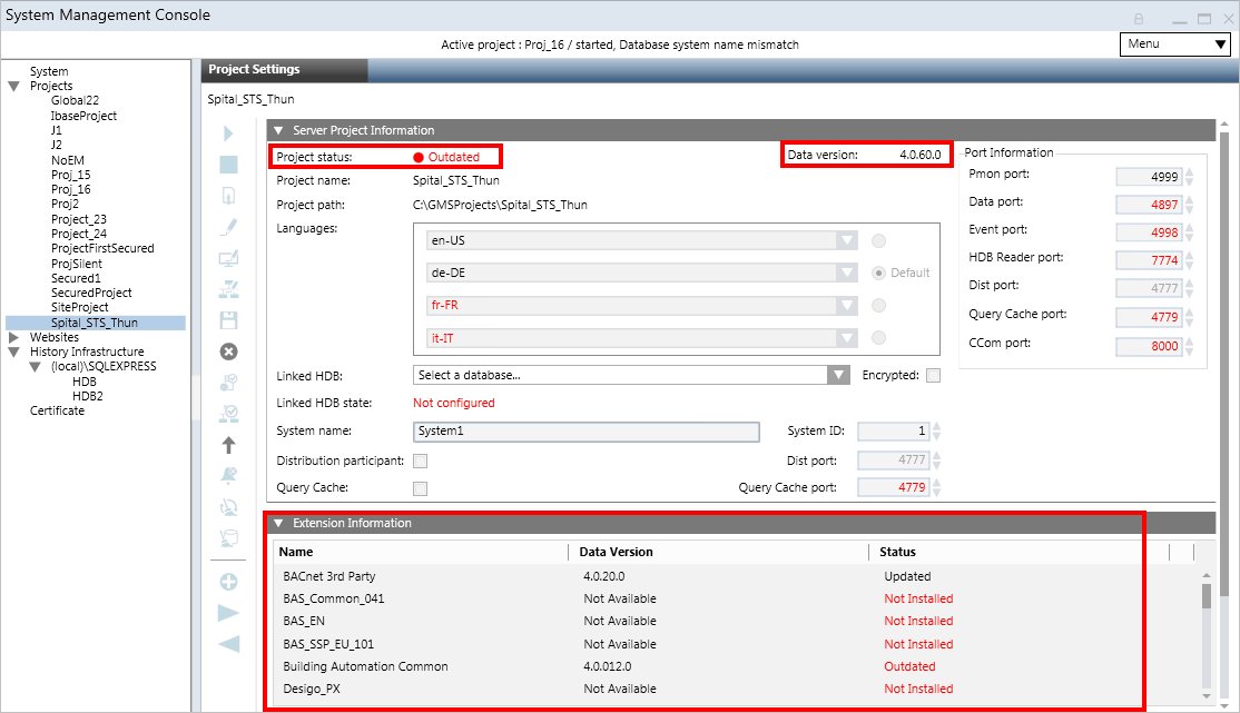 Sollte im Expander Serverprojektinfo weiterhinVeraltet(rot) angezeigt werden, müssen Sie den zugehörigen Hauptprojektordner auswählen und den Projektstatus aktualisieren. - Systemname wird als