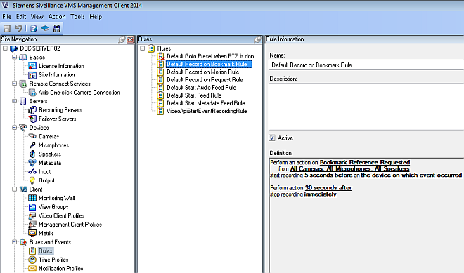 In Desigo CC wird die Bookmark-Aufzeichnung automatisch ausgelöst, wenn der Bediener einen der Markerbefehle auf dem Register Bedienung ausgibt, d.h. Freier Marker, Aufzeichnungsmarker oder Manueller Marker. Um die Bookmark-Aufzeichnung verwenden zu können, muss die Default Record on Bookmark Rule vorhanden und in VMS aktiv sein. Dies ist die Standardeinstellung nach einer VMS-Installation.