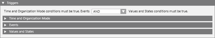 - Verwenden Sie die Dropdown-Liste UND/ODER oben, um die boolesche Logik zwischen den Triggern zu bestimmen: Bedingungen bezüglich Zeit und Betriebsart müssen wahr sein. Alarme UND/ODER Bedingungen aus Werten und Zuständen müssen wahr sein.
