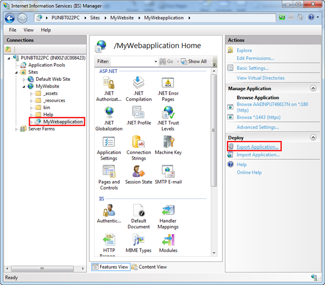 Hinweis: Das Menü Applikation exportieren wird nur angezeigt, wenn Web Deploy installiert ist.