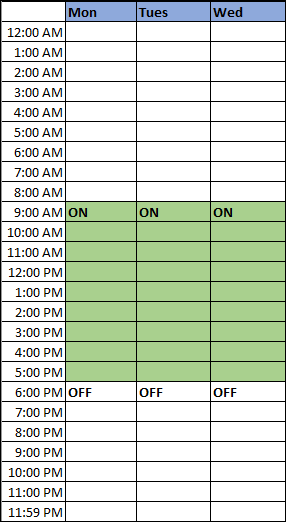 Zeitraum für den Zeitplan (Aktiv: 12:00 a.m., Inaktiv: 9:00 Uhr, Aktiv: 18:00 Uhr)