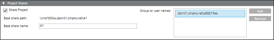 - Wenn Sie nach dem Erstellen eines Projekts den Projektordner unter Windows freigeben und das Projekt dann an der SMC auswählen, werden im Expander Projekt-Shares die Einstellungen des Projekt-Shares angezeigt. Das heisst, dass das Kontrollkästchen Projekt freigeben aktiviert ist und dass die Liste der Gruppen- oder Benutzernamen die Benutzer bzw. Gruppen enthält, denen Sie Berechtigungen auf den freigegebenen Projektordner erteilt haben.