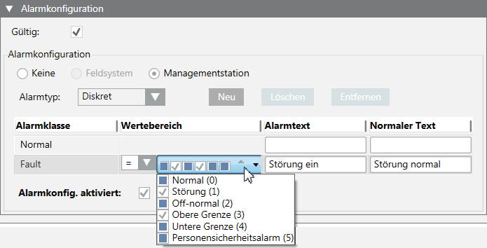 - Wählen Sie im Expander Alarmkonfiguration die Option Gültig. Die Aktivierung wird grau dargestellt.
