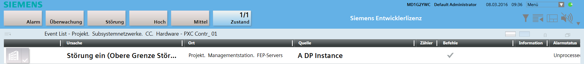 - Der Alarm wird ausgelöst und in der Übersichtsleiste unter der Alarmkategorie Zustand angezeigt. In der Spalte Ursache werden der definierte Alarmtext Störung ein und in Klammern die beiden definierten Zustände (Obergrenze Störung) angezeigt.