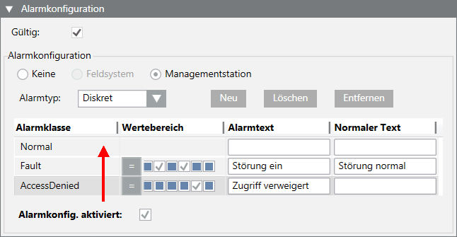 Hinweis: Wenn mehrere Alarmbedingungen definiert werden, muss der Alarm mit der höchsten Alarmpriorität unten definiert werden, da die Alarmverarbeitung von unten nach oben erfolgt. Sobald eine Bedingung erfüllt ist, werden die verbleibenden Alarmdefinitionen nicht mehr ausgewertet.
