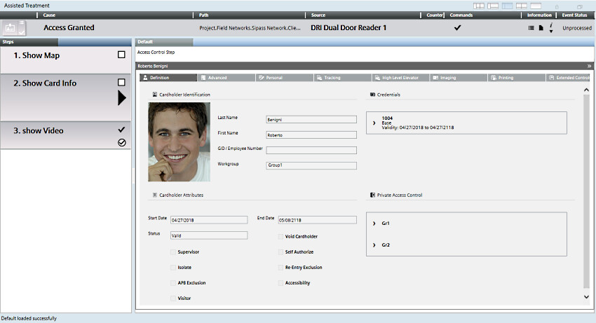 SiPass event pertaining to a door reader object | The relevant cardholder information is displayed