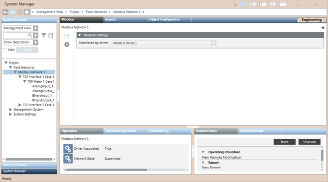 In Engineering mode, after selecting a Modbus network in System Browser, you can configure its network settings using the Network Settings expander of the Modbus tab. You can only delete the Modbus network. The properties associated with the selected network display in the Operation/Extended Operation tabs.